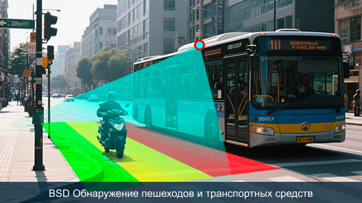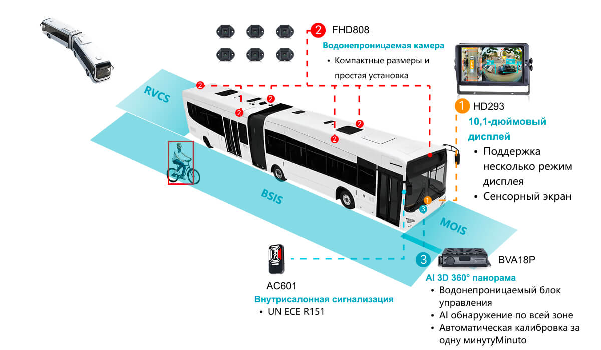Система 360° обзора интеллектуально адаптируется к изменению угла сочленения автобусов, обеспечивая бесшовное изображение и полное AI-обнаружение. Мониторинг в реальном времени передаётся на платформу для удалённого управления, предоставляя водителю вид с высоты птичьего полёта и значительно повышая безопасность движения.