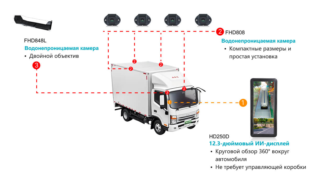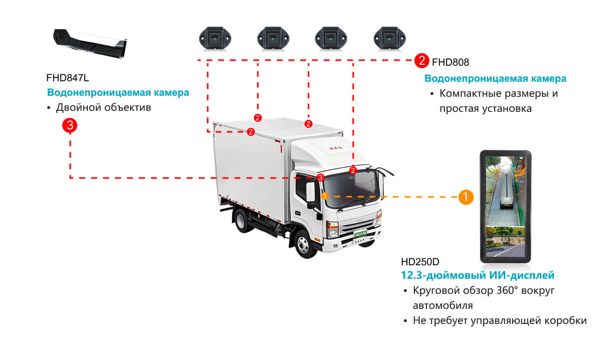 Обеспечивает обзор передней, левой и правой зон для устранения слепых зон и предотвращения столкновений. Включает мониторинг заднего вида при движении задним ходом и поворотах, соответствует R158. Поддерживает адаптивное переключение между режимами 270° + задний вид или 360° + задний вид в зависимости от конфигурации камер。
