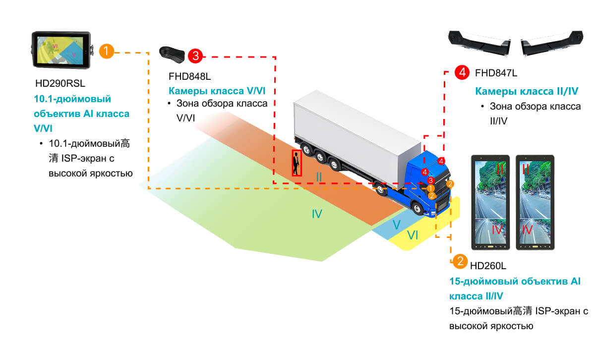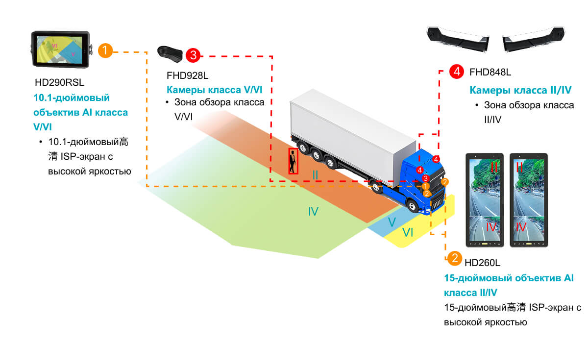 Поддерживает различные режимы установки и отображения (например, левый/правый/передний и левый/правый/задний), обеспечивает круговой мониторинг вокруг транспортного средства без слепых зон с помощью трех камер. Соответствует требованиям к полю обзора зеркал Категории V/VI, поддерживает до 6-CH входов и обеспечивает всестороннюю защиту безопасности грузовых перевозок.